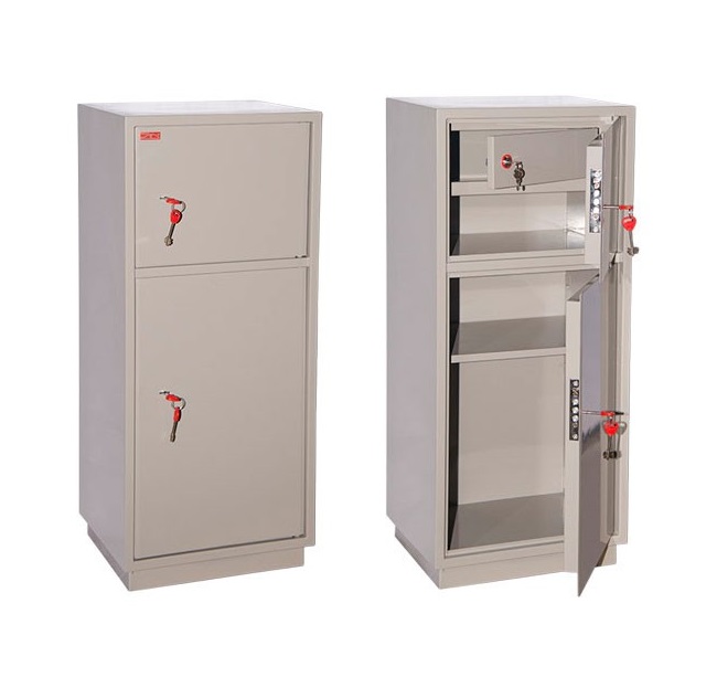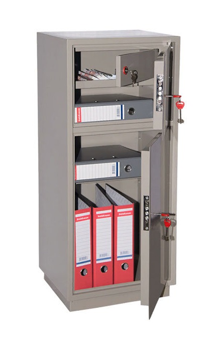 Бухгалтерский шкаф КБС-42Т от производителя ПАКС как и все бухгалтерские шкафы данной серии, предназначен для хранения офисной и бухгалтерской документации, электронных носителей информации, учредительных документов и прочих необходимых вещей не только в бухгалтерии, но и в офисах, архивах, на производстве и в прочих коммерческих помещениях. Модель КБС-42Т пользуется достаточно большим спросом, имеет хорошую репутацию у покупателей, достаточно надежна и долговечна. Корпус шкафа изготовлен из стального листа толщиной 1.5 миллиметра. Двери изнутри усилены панелью коробчатого сечения из стали толщиной 0.8 миллиметра. Горизонтальная перегородка делит шкаф на 2 независимых отделения, запираемых собственной дверью. В верхнем отделении шкафа КБС-42Т располагается кассовое отделение/трейзер, а в нижнем съемная регулируемая по высоте полка. Шкаф имеет подиум (подставку) высотой 47 мм для возможности размещения его вплотную к стене. Закрывается КБС-42Т врезным 8ми сувальдным ключевым замком Про Сам, 2 ключа поставляются в комплекте. Шкаф окрашен полимерной порошковой краской серого цвета, неброской и достаточно приятной взгляду, модель поставляется в собранном виде.
