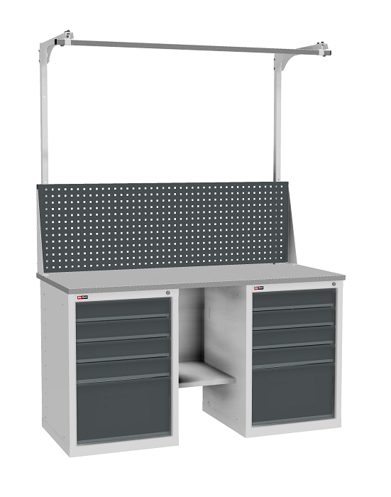 В комплектацию верстака входит: столешница ВЛ-К 150, полка и стенка ВЛ-К, две тумбы ВЛ-К-015, один перфорированный экран ВЛ-К-150-Э2. Столешница выполнена из фанеры (24 мм) с покрытием из оцинкованного листа металла. Тумба ВЛ-К-015 комплектуется 5 выдвижными ящиками с телескопическими направляющими. Полезный размер ящиков (ВхШхГ): 1-280х459х459 мм, 4-80х459х459 мм. Тумба закрывается центральным ключевым замком (50 000 циклов). Перфорированный экран предназначен для размещения навесных аксессуаров. В комплекте экрана: один экран, комплект упоров, две стойки, перекладина-направляющая. Размер квадратной перфорации 10х10 мм, шаг установки аксессуаров 35 мм.