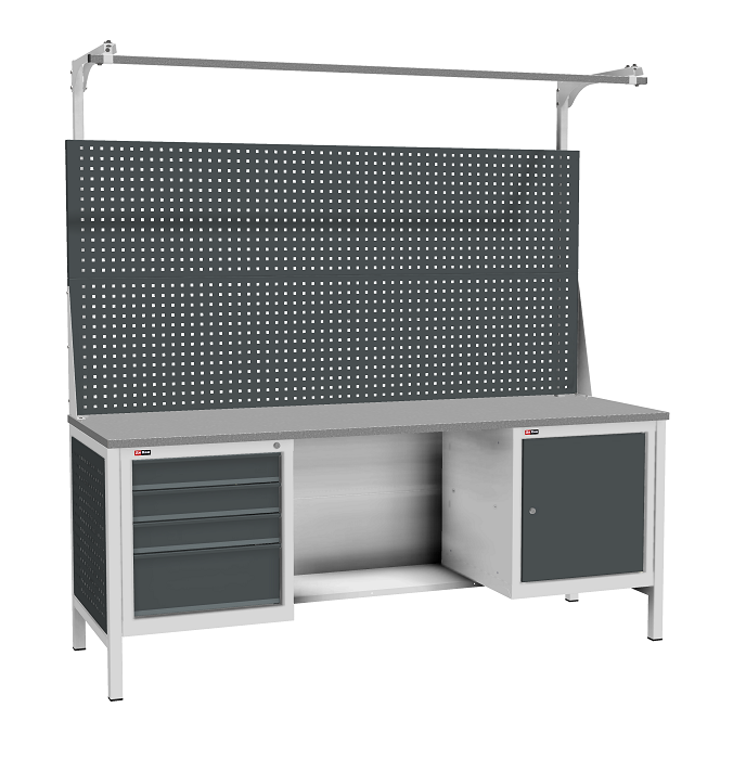 Цвет верстака: серый Ral 7038, панель облицовочная и лицевая панель ящиков/дверей антрацит Ral 7016. Тип покрытия: эпоксидная порошковая краска. Поставляется в разобранном виде